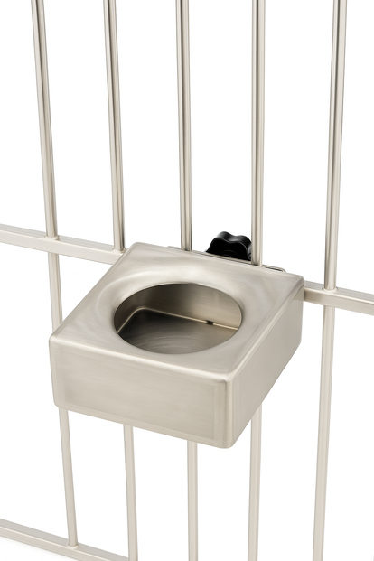 De drinkbak is eenvoudig afneembaar voor reiniging en beschikt over een handig afvoer-schroefje onderaan om overtollig water weg te laten lopen zonder te hoeven demonteren.