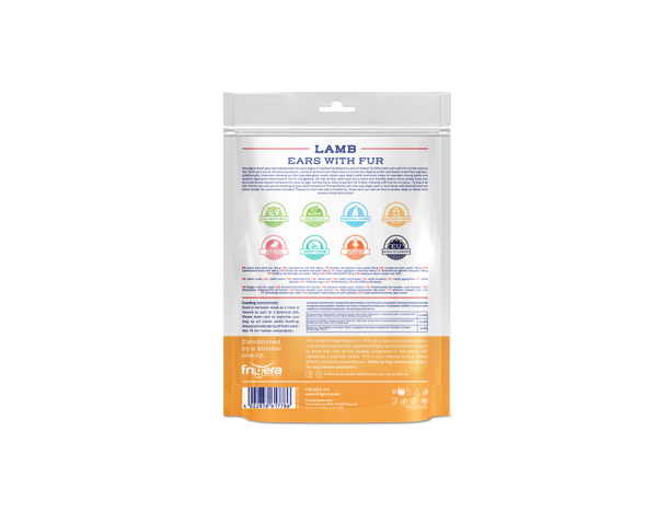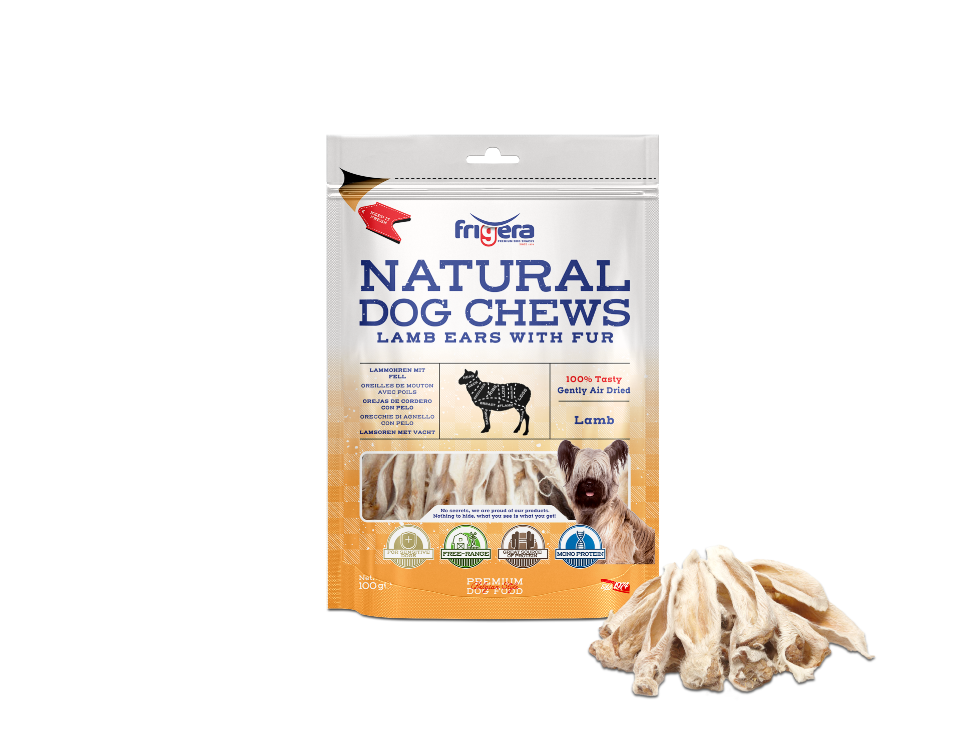 Zijn varkens- of runderoren te mainstream voor jouw hond of is hij/zij intolerant voor deze? In dat geval vormen friGERA lamsoren met vacht een ideaal alternatief! Onze lamsoren zijn een volledig natuurlijk product, zorgvuldig gedroogd om ze te veranderen in een knapperige, maar iets zachtere en magerdere traktatie dan varkensoren. Bovendien reinigt intensief kauwen op deze hypoallergene snack het gebit van jouw hond en helpt zelfs bij het behoud van sterke gewrichten en gezonde gewrichtsbanden, omdat ze rijk zijn aan mangaan. Bovendien zijn lamsoren milieuvriendelijker, omdat schapen minder belastend zijn voor het milieu dan koeien of varkens. Ook zijn ze perfect om binnenshuis op te kauwen, met weinig tot geen geur. Verder kan de vacht helpen bij de natuurlijke reiniging van de darmen van jouw hond! Dit past perfect bij de manier waarop honden vroeger op wilde dieren jaagden en ze in hun geheel opaten, vacht en botten inbegrepen! Dankzij hun grootte en consistentie kunnen deze oren ook gevoerd worden aan kleinere honden of honden met zwakkere kauwspieren!