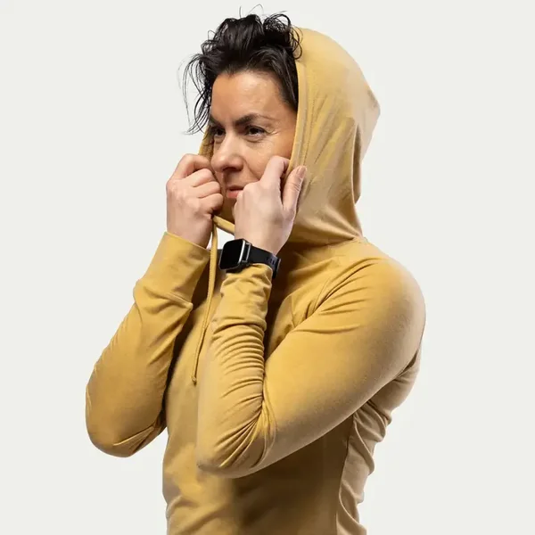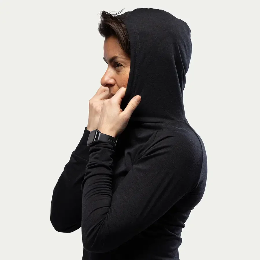 Deze hoodie is ontworpen voor maximaal comfort, met een relaxte pasvorm die bewegingsvrijheid biedt, en een verstelbare capuchon met trekkoord voor extra warmte en bescherming. De merinowolmix reguleert van nature de temperatuur, voert vocht af en voorkomt geurtjes, waardoor het perfect is voor een actieve levensstijl.
