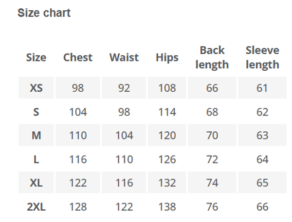 Pasvorm: de jas valt iets kleiner uit. Twijfel je tussen twee maten? Kies dan de grotere maat.