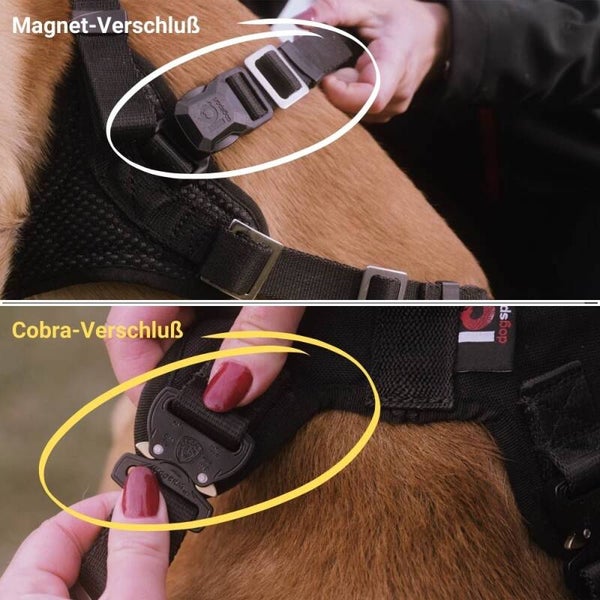 En het beste deel? De innovatieve magnetische gespen (met een breekbelasting van meer dan 200 kg per gesp) maken het aandoen van het harnas ongelooflijk snel en eenvoudig! De magnetische sluitingen lijnen automatisch uit, wat vooral praktisch is wanneer je hond voor de training overenthousiast is. Eenmaal op hun plaats, vergrendelen ze mechanisch – en kunnen moeiteloos worden losgemaakt met slechts twee vingers.