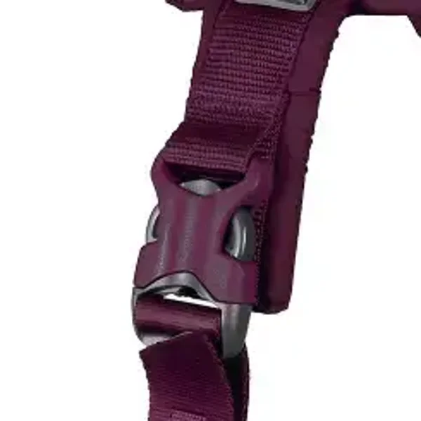 Het harnas is verstelbaar rond de borst. Na de eerste afstelling is het gemakkelijk om het harnas aan en uit te doen door de stevige Duraflex® gespen aan beide zijden te openen. De borstriemen worden eenvoudig vergrendeld door het uiteinde van de riem terug door de sliplock te halen.