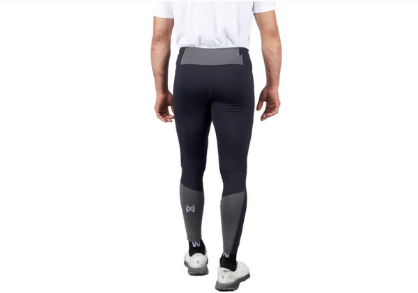De tights zijn verkrijgbaar in zwart/grijs, in de maten XS–XL.