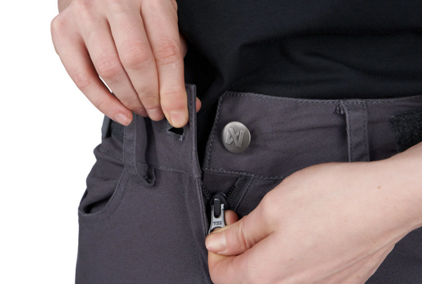 Het diamantkruis en het geïntegreerde elastaan verhogen de bewegingsvrijheid tijdens het wandelen en verminderen schuren. Voorgevormde knieën zorgen voor ongehinderde beweging en comfort wanneer je bukt of met je hond bezig bent.