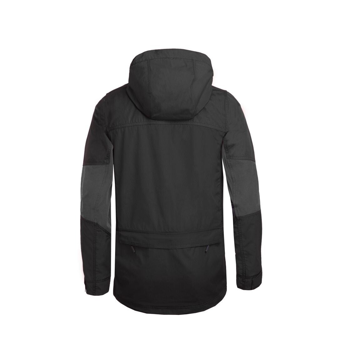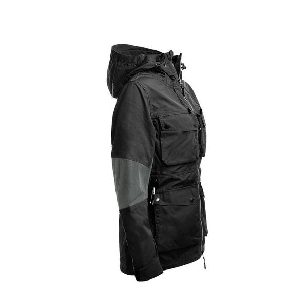 Gemaakt van een polyester/katoen mix met inzetstukken in stretchmateriaal voor de beste pasvorm en bewegingsvrijheid. Ventilatieritsen aan de zijkanten zorgen voor extra ademend vermogen. De jas heeft veel praktische zakken: een grote achterzak met rits, twee borstzakken met klep én extra ritszakken aan de zijkant. Onderaan bevinden zich grote zakken met klep en ritszakken aan de zijkant. De linker onderzak is aan de binnenkant gevoerd met waterdicht nylon, ideaal wanneer je hondensnoepjes bij je hebt. Aan de binnenkant zitten twee grote binnenzakken van polyester mesh.