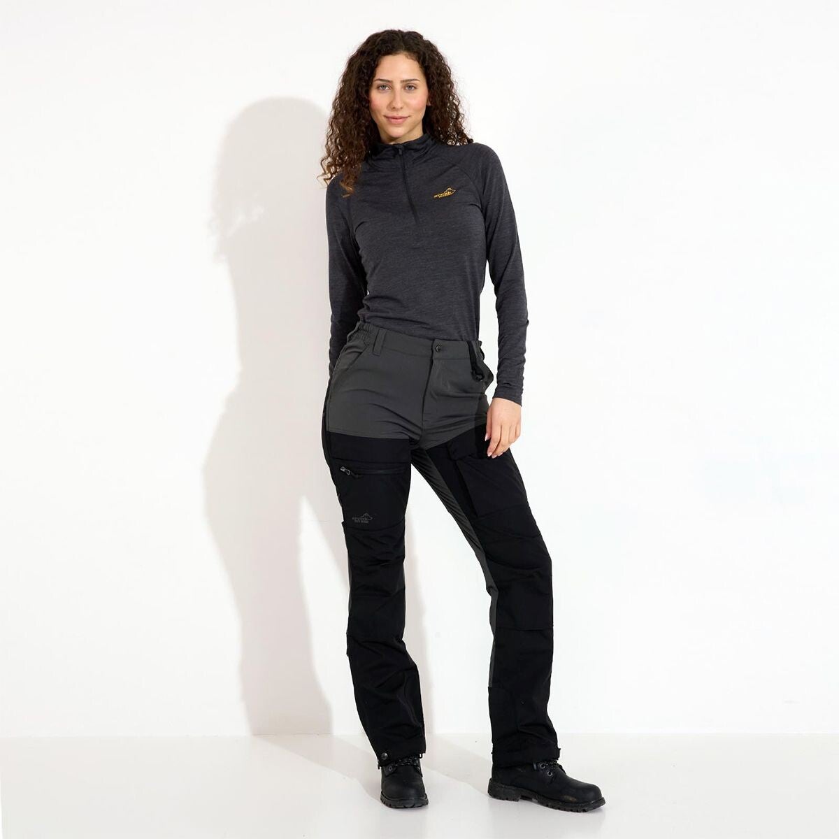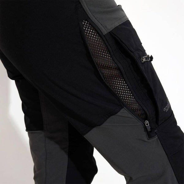 Bovenaan bevinden zich open handzakken. Verder heeft de broek een D-ring en ruime dijzakken, waarbij de rechter dijzak twee ritszakken heeft. In deze rechter dijzak zit bovendien een apart vakje voor je telefoon. Aan de zijkanten zitten ventilatieritsen. De knieën hebben vakken waarin kniebescherming geplaatst kan worden. Onderaan de pijpen zit een rits zodat je makkelijker in laarzen of boots kunt stappen, en dit kan tevens dienen als extra ventilatie. De binnenkant van de pijpuiteinden is verstevigd. De broekspijpen zijn verstelbaar met drukknopen en hebben een haak die je aan de schoenveter kunt bevestigen, zodat de broekspijp stevig tegen de schoen blijft zitten.