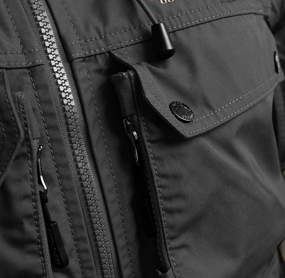 Gemaakt van een polyester/katoen mix met inzetstukken in stretchmateriaal voor de beste pasvorm en bewegingsvrijheid. Ventilatieritsen aan de zijkanten zorgen voor extra ademend vermogen. De jas heeft veel praktische zakken: een grote achterzak met rits, twee borstzakken met klep én extra ritszakken aan de zijkant. Onderaan bevinden zich grote zakken met klep en ritszakken aan de zijkant. De linker onderzak is aan de binnenkant gevoerd met waterdicht nylon, ideaal wanneer je hondensnoepjes bij je hebt. Aan de binnenkant zitten twee grote binnenzakken van polyester mesh.