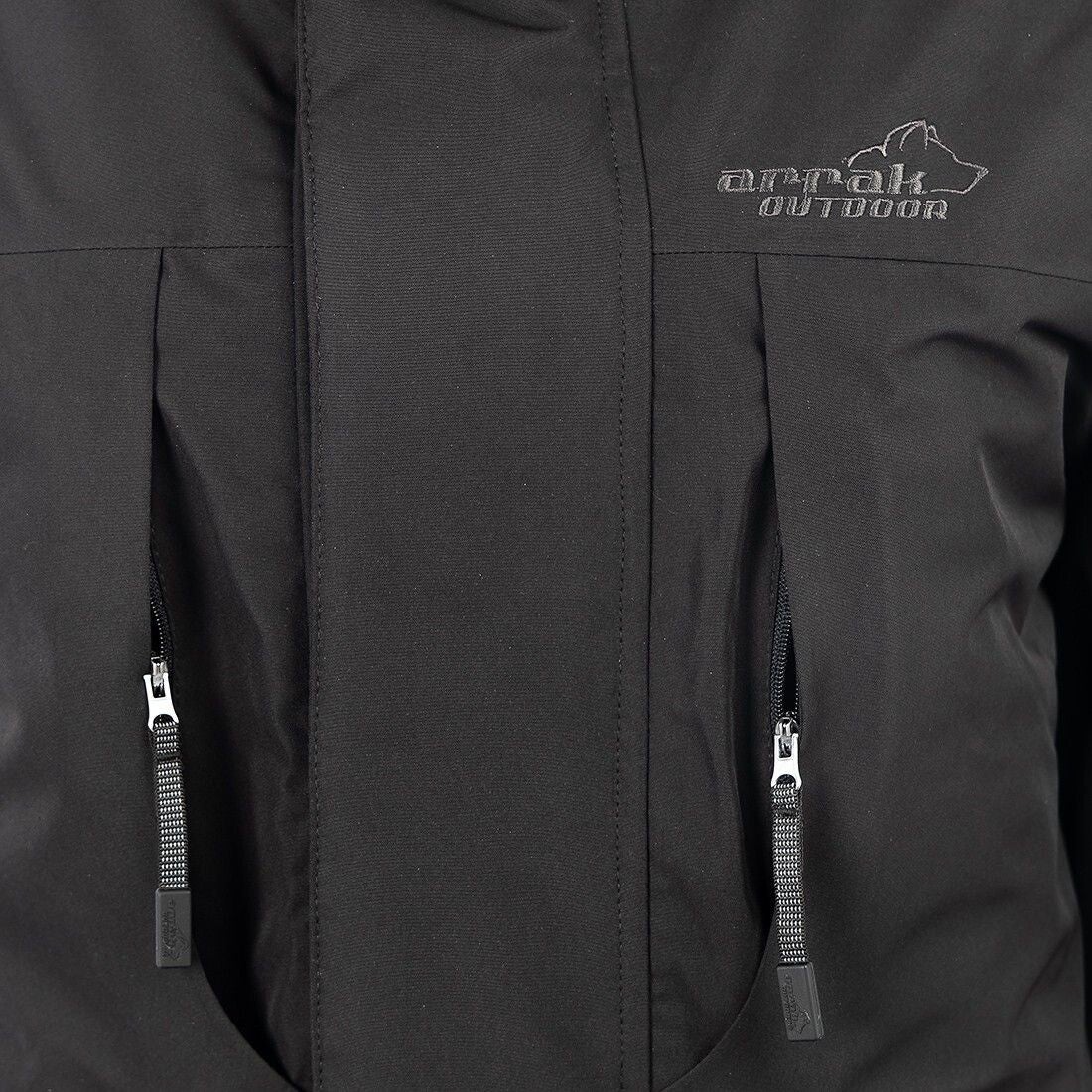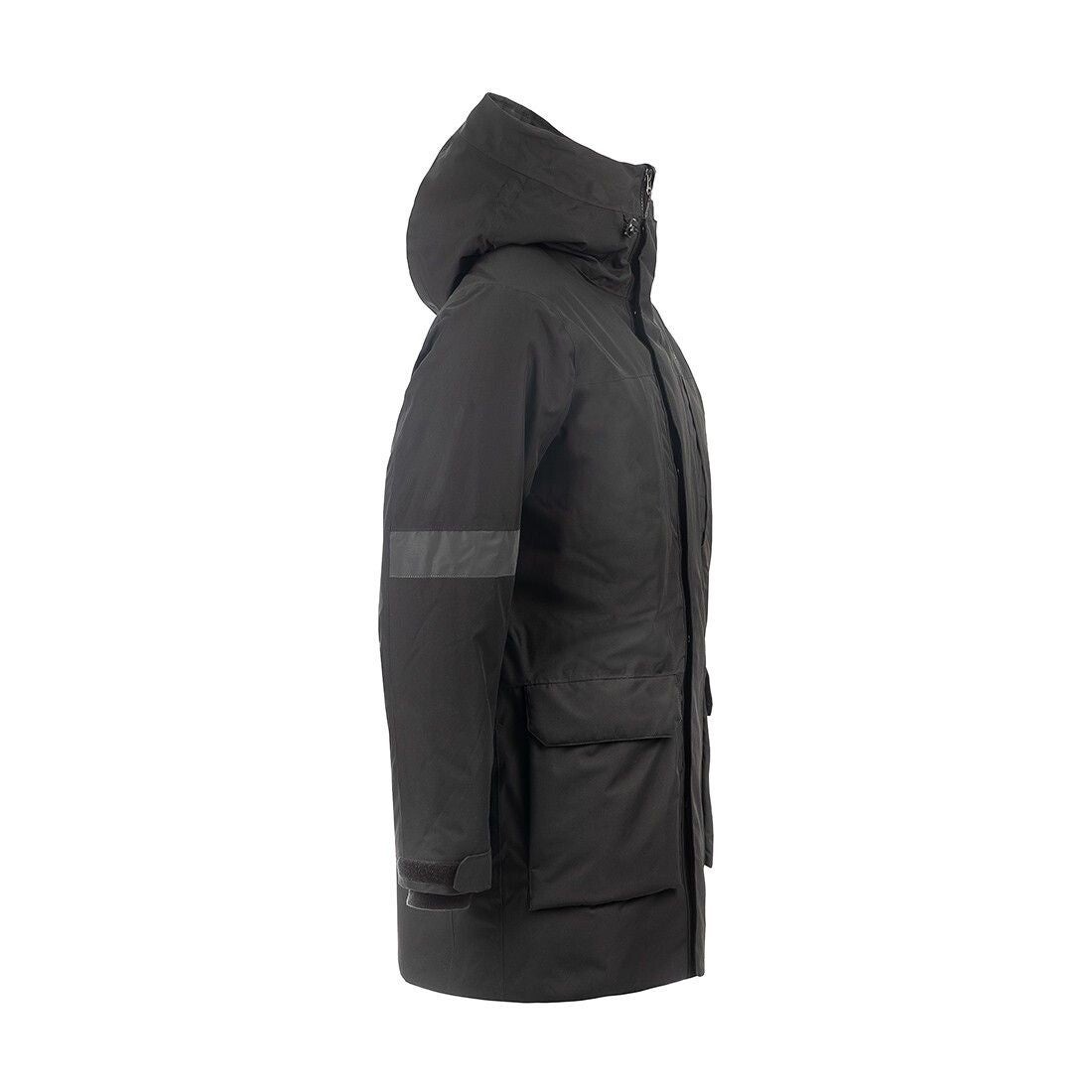 De parka heeft een grote achterzak, twee voorzakken met klep en handzakken aan de zijkant met een warme microfleece voering. In de linker voorzak zit bovendien een uitneembaar snoepzakje. Verborgen borstzakken met rits. Aan de binnenkant, langs de knopenrij, zit een binnenzak met rits. Daarnaast zijn er twee grote mesh binnenzakken — perfect voor handschoenen of extra spullen. De jas heeft een 2-weg rits aan de voorkant, een grote stevige verstelbare capuchon en gebreide manchetten aan de polsen.