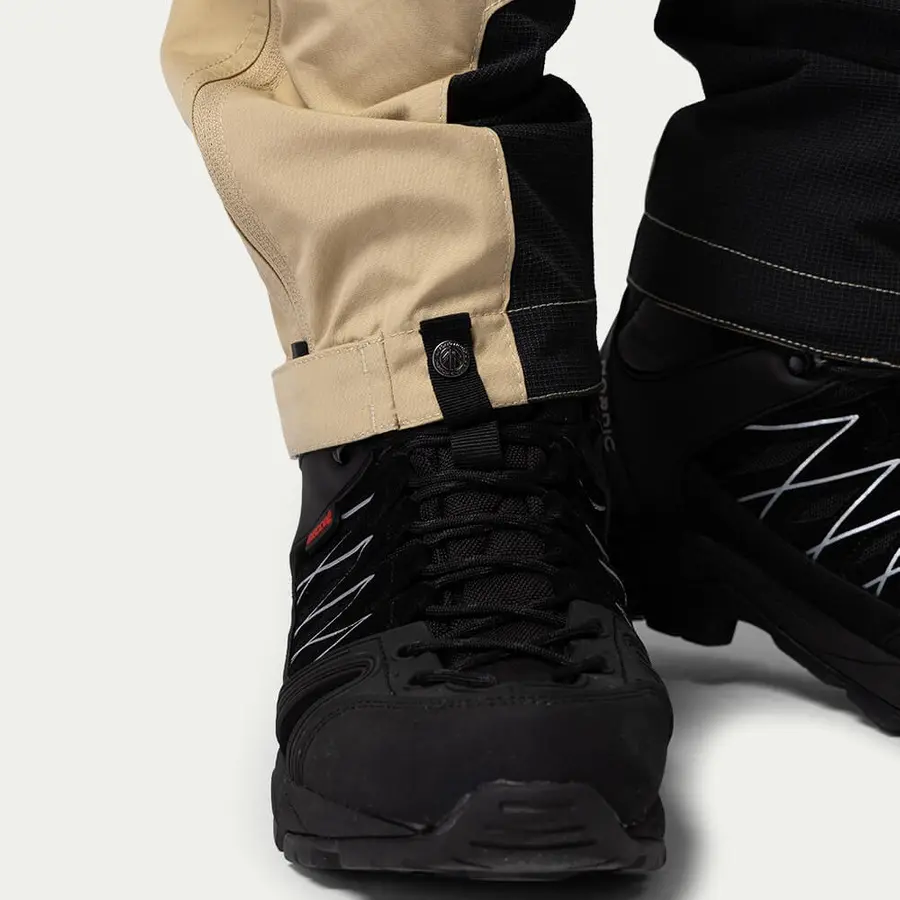 Verstevigde onderbeenstukken beschermen tegen slijtage door laarzen en ruw terrein, terwijl de schoenhaak en verstelbare pijpuiteinden zorgen voor een stevige pasvorm. Een versterkt kruis met driedubbele stiksels verhoogt de duurzaamheid bij intensief gebruik, en versterkte riemlussen met bevestigingspunt aan de voorkant zijn ideaal voor een karabijnhaak of klein gereedschap. Een dubbele knoopsluiting in de taille zorgt voor extra stabiliteit en comfort onderweg.